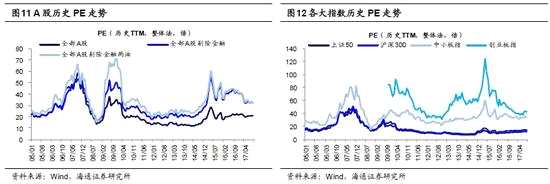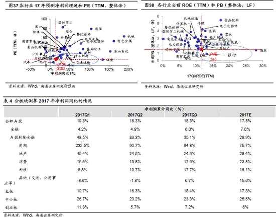 預(yù)計(jì)A股17年凈利同比17.5%。考慮全年凈利潤(rùn)占比分布變化,我們根據(jù)歷史上各季度凈利潤(rùn)占全年的比重和17年三季報(bào)業(yè)績(jī),推算全部A股17年全年預(yù)測(cè)凈利同比(PE(TTM,整體法,下同))為17.5%(20.1倍),剔除金融后為28.9%(31.0倍),剔除金融兩油后為37.4%(31.1倍)。按照同樣的方法,推算17年上證綜指預(yù)測(cè)凈利同比(PE)為17.2%(15.9倍),上證50為10.9%(11.7倍),滬深300為12.7%(14.3倍),中小板指為17.4%(34.4倍),創(chuàng)業(yè)扳指為-2.8%(41.2倍)。