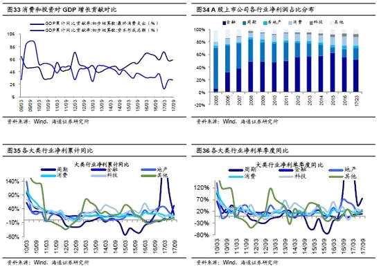 17年Q3消費(fèi)和科技凈利占比整體較中報(bào)回升。從大類行業(yè)累計(jì)凈利占A股比重看,17年Q3金融為51.8%,周期為18.5%,房地產(chǎn)為3.6%,消費(fèi)為14.4%,科技為4.7%,其他為6.9%,金融、消費(fèi)、周期凈利潤(rùn)占A股比重達(dá)到90%左右。金融業(yè)凈利占比從06年以來(lái)逐步回升,最高在15年達(dá)到63.1%,此后開始回落,17年 Q3降至51.8%。周期凈利占比從06年起開始震蕩回落,最低在15年達(dá)到8.5%,此后略有回升17年Q3達(dá)到18.5%,與14年相當(dāng)。消費(fèi)凈利占比從08年的7.0%最高回升至16年的15.0%,此后略有回落,17年Q2為14.4%,仍處在歷史高位??萍純衾急葟?6年1.1%一路回升至17Q2的4.7%,整體處于上升趨勢(shì)中??梢?jiàn),金融和周期行業(yè)凈利占比整體處于下降趨勢(shì)中,而消費(fèi)和科技占比正在回升,企業(yè)盈利數(shù)據(jù)顯示經(jīng)濟(jì)結(jié)構(gòu)轉(zhuǎn)型已在路上。從宏觀數(shù)據(jù)看,GDP同比從2010Q1的12.2%一路回落到2016Q2的6.7%,之后維持在6.7%~ 6.9%之間,宏觀經(jīng)濟(jì)保持平穩(wěn)。從GDP構(gòu)成角度看,消費(fèi)取代投資成為拉動(dòng)經(jīng)濟(jì)增長(zhǎng)的主要驅(qū)動(dòng)力,17年三季度消費(fèi)、投資對(duì)GDP貢獻(xiàn)率分別為64.5%、32.8%,而10年分別為37.3%、54.8%,經(jīng)濟(jì)結(jié)構(gòu)轉(zhuǎn)型已在路上。