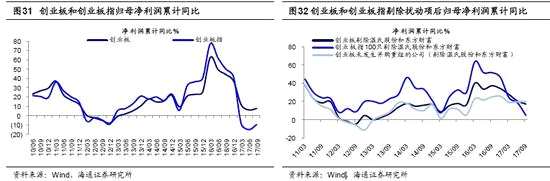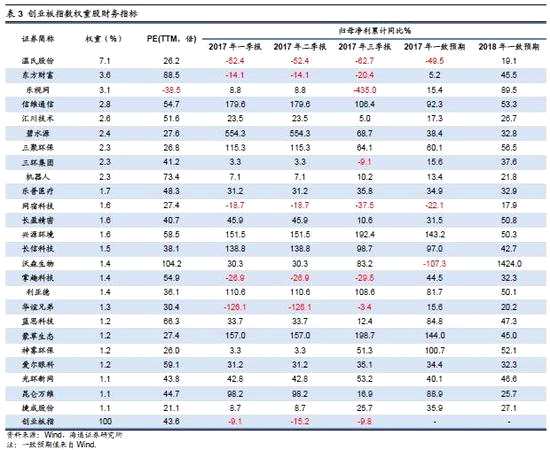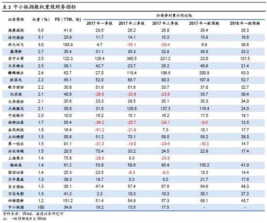 在并購(gòu)重組政策趨緊背景下,創(chuàng)業(yè)板凈利保持低增長(zhǎng)。17Q3/17Q2/17Q1創(chuàng)業(yè)板歸屬母公司凈利潤(rùn)累計(jì)同比為7.2%/5.7%/11.2%,單季度同比為8.7%/1.9%/11.2%,凈利同比保持低位增長(zhǎng)。剔除溫氏股份(300498)和東方財(cái)富(300059) 后,歸母凈利累計(jì)同比為20.8%/23.1%/27.6%,單季度為16.9%/20.3%/27.6%,凈利增速持續(xù)下滑。進(jìn)一步看創(chuàng)業(yè)板指數(shù)的情況,歸母凈利潤(rùn)累計(jì)同比為-9.8%/-15.2%/-9.1%,單季度同比為-8.0%/-21.7%/-9.1%。剔除溫氏股份和東方財(cái)富后,歸母凈利累計(jì)同比為14.3%/20.7%/24.1%,單季度為4.4%/18.3%/24.1%,業(yè)績(jī)同樣出現(xiàn)下滑。其中,部分權(quán)重股如樂(lè)視網(wǎng)(300104) (17年三季報(bào)歸母凈利累計(jì)同比為-435%)、溫氏股份(-63%)、網(wǎng)宿科技(300017) (-38%)、掌趣科技(300315) (-30%)、東方財(cái)富(-20%)等凈利潤(rùn)大幅下滑。今年以來(lái)創(chuàng)業(yè)板業(yè)績(jī)下滑主要是受到外延收入收縮拖累,為考核創(chuàng)業(yè)板內(nèi)生增速,以創(chuàng)業(yè)板未進(jìn)行重大資產(chǎn)重組和定增重組的公司為樣本,可得17Q3/17Q2/17Q1創(chuàng)業(yè)板未進(jìn)行重組公司(剔除溫氏和東財(cái))凈利累計(jì)同比為19.6%/19.2%/18.6%,凈利單季度同比為19.8%/19.6%18.6%,創(chuàng)業(yè)板未進(jìn)行重組公司比創(chuàng)業(yè)板指成分股更優(yōu)異。當(dāng)前上市公司并購(gòu)重組難度加大,只能更多依靠?jī)?nèi)生增長(zhǎng),但13-16年期間大量公司進(jìn)行并購(gòu)重組并作出業(yè)績(jī)承諾,這在短期內(nèi)保證公司業(yè)績(jī)高增長(zhǎng),但將透支上市公司未來(lái)業(yè)績(jī),這就導(dǎo)致當(dāng)前未進(jìn)行并購(gòu)重組的上市公司業(yè)績(jī)更優(yōu)異。17Q3/17Q2/17Q1創(chuàng)業(yè)板ROE(TTM)為8.4%/8.5%/8.6%,凈利率為10.1%/9.9%/9.1%,資產(chǎn)周轉(zhuǎn)率為0.49/0.49/0.11次,資產(chǎn)負(fù)債率為39.2%/38.3%/36.6%。考慮并購(gòu)重組因素消除后全年凈利占比分布更均勻,根據(jù)歷史上創(chuàng)業(yè)板三季報(bào)凈利潤(rùn)占全年比重和17年三季報(bào)業(yè)績(jī),我們推算全年創(chuàng)業(yè)板凈利同比增速為6%,ROE為8.4%。