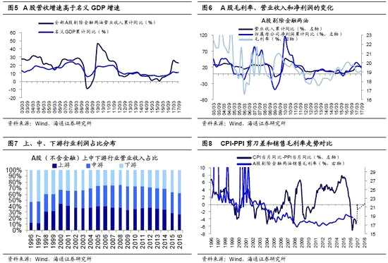 營(yíng)業(yè)收入同比增速略回落。17Q3/17Q2/17Q1全部A股營(yíng)收累計(jì)同比為19.5%/19.8%/21.0%,剔除金融后為22.5%/23.5%/25.4%,剔除金融兩油后為22.7%/23.7%%/25.4%,營(yíng)收同比略回落。歷史上,營(yíng)收同比與名義GDP增速走勢(shì)大致趨同,表明上市公司業(yè)績(jī)是國(guó)民經(jīng)濟(jì)狀況的映射。13年以后兩者均在低位震蕩,16年起開始回升,A股剔除金融兩油營(yíng)收累計(jì)同比從15Q4的0.5%最高攀升至17Q2的23.7%,名義GDP累計(jì)同比從15Q4的6.4%一路回升至17Q2的11.1%。17Q3營(yíng)收累計(jì)同比較名義GDP增速高12.6個(gè)百分點(diǎn),遠(yuǎn)高于05年以來(lái)兩者6個(gè)百分點(diǎn)的偏差均值,營(yíng)收同比和名義GDP增速差異擴(kuò)大源于中國(guó)經(jīng)濟(jì)正在調(diào)結(jié)構(gòu)、促轉(zhuǎn)型,新時(shí)代的基本面特征為經(jīng)濟(jì)平盈利上,微觀盈利上源于產(chǎn)業(yè)結(jié)構(gòu)優(yōu)化、行業(yè)集中度提高和企業(yè)國(guó)際化加速,類似日本1975-89年以及美國(guó)1983-2000年(詳見(jiàn)《為何新時(shí)代經(jīng)濟(jì)平盈利上?——借鑒日本1970-80年代》-20171027)。