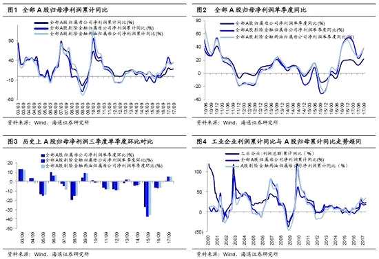 三季度A股凈利潤(rùn)同比增速回升,環(huán)比高于歷史均值。截至10月31日,全部A股上市公司公布了2017年三季報(bào)。17Q3/17Q2/17Q1全部A股歸屬母公司凈利累計(jì)同比分別為18.3%/16.3%/19.8%,剔除金融后為35.1%/33.3%/48.5%,剔除金融兩油后為35.0%/33.1%/48.3%,凈利潤(rùn)同比增速均回升。歷史上,A股歸母累計(jì)凈利同比和工業(yè)企業(yè)利潤(rùn)總額累計(jì)同比走勢(shì)大致趨同。全部A股歸母凈利累計(jì)同比從2010Q1的61.4%開始持續(xù)下滑,最低至12Q3的-2.1%,此后窄幅波動(dòng),16年Q3開始由負(fù)轉(zhuǎn)正,17Q1最高至19.8%。工業(yè)企業(yè)利潤(rùn)累計(jì)同比也從10年2月的119.7%開始持續(xù)下行,12年2月達(dá)到最低的-5.2%,此后維持低位波動(dòng),16年初開始由負(fù)轉(zhuǎn)正,17年2月最高達(dá)31.5%,近期工業(yè)企業(yè)利潤(rùn)累計(jì)同比雖有所下滑,但仍保持20%以上的高速增長(zhǎng)。進(jìn)一步分析單季度表現(xiàn),全部A股17Q3/17Q2/17Q1歸母凈利潤(rùn)單季度同比為21.9%/13.2%/19.8%,剔除金融后為38.2%/22.6%/48.5%,剔除金融兩油后為38.3%/22.8%/48.3%,單季度凈利同比均回升。從環(huán)比來(lái)看,17Q3全部A股、剔除金融、再剔除兩油的歸母凈利潤(rùn)環(huán)比分別為0.6%、5.3%、5.4%,而2011年以來(lái)三季度環(huán)比的平均值為-9.3%、-10.6%、-10.2%,17Q3A股凈利環(huán)比增速均高于歷史均值。