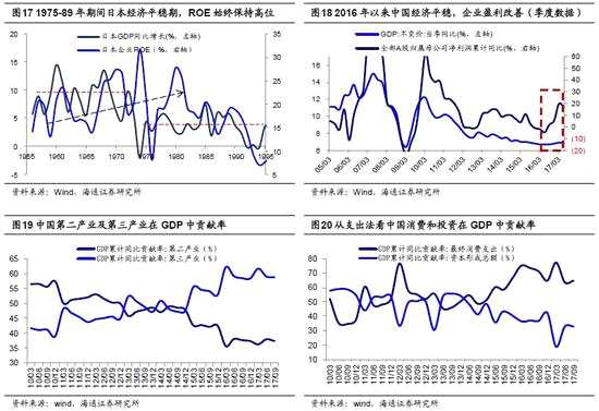 三季報(bào)業(yè)績(jī)進(jìn)一步確認(rèn)新時(shí)代的基本面特征:經(jīng)濟(jì)平盈利上。在《中國(guó)目前類似日本1975-89年初期?——多資產(chǎn)視角看股市-20170913》報(bào)告中,我們從過(guò)去1-2年來(lái)中國(guó)大類資產(chǎn)表現(xiàn)出發(fā)分析指出,中國(guó)正步入經(jīng)濟(jì)平盈利上的階段。在《新時(shí)代的股市:經(jīng)濟(jì)平盈利上-20171022》中提出在新時(shí)代我國(guó)經(jīng)濟(jì)增長(zhǎng)模式從加大要素投入轉(zhuǎn)變?yōu)橐揽縿?chuàng)新驅(qū)動(dòng),基本面特征表現(xiàn)為經(jīng)濟(jì)平而盈利上。經(jīng)濟(jì)平、盈利上是新時(shí)代的特征,這是經(jīng)濟(jì)結(jié)構(gòu)調(diào)整、產(chǎn)業(yè)轉(zhuǎn)型過(guò)程中出現(xiàn)的特征,日本曾經(jīng)在1975-89年經(jīng)歷過(guò)。在《為何新時(shí)代經(jīng)濟(jì)平盈利上?——借鑒日本1970-80年代-20171027》中,我們進(jìn)一步提出微觀盈利向上源于產(chǎn)業(yè)結(jié)構(gòu)優(yōu)化、行業(yè)集中度提升、企業(yè)國(guó)際化加快。在產(chǎn)業(yè)結(jié)構(gòu)方面,過(guò)去1-2年消費(fèi)ROE維持在11%-12%,科技為8%-9%,而周期為5-6%,盈利能力較強(qiáng)的消費(fèi)和科技占比提高推動(dòng)整體業(yè)績(jī)改善。在行業(yè)集中度方面,行業(yè)集中度提升強(qiáng)化龍頭地位,加之龍頭經(jīng)營(yíng)效率更高、盈利能力更強(qiáng),績(jī)優(yōu)龍頭推動(dòng)整體盈利改善。在企業(yè)國(guó)際化方面,中國(guó)企業(yè)國(guó)際化加快得益于國(guó)內(nèi)自主品牌崛起和海外需求回暖,自2014H1起A股海外業(yè)務(wù)營(yíng)收增速超國(guó)內(nèi)業(yè)務(wù),高增長(zhǎng)的海外業(yè)務(wù)有助整體盈利改善。A股盈利從2016年中開始拐頭向上,三季報(bào)顯示17Q3/17Q2/17Q1全部A股歸屬母公司凈利累計(jì)同比分別為18.3%/16.3%/19.8%,ROE(TTM)分別為10.3%/10.1%/9.7%,盈利向上趨勢(shì)進(jìn)一步得到確認(rèn)。展望2018年,我們認(rèn)為盈利向好趨勢(shì)不變,初步測(cè)算18年全部A股凈利同比為13.5%,ROE為11%。