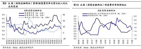 三季報(bào)三項(xiàng)費(fèi)率較中報(bào)略回升。17Q3/17Q2/17Q1全部A股的管理費(fèi)用率為7.7%/7.5%/7.5%,銷售費(fèi)用率為4.2%/4.1%/4.2%,財(cái)務(wù)費(fèi)用率為1.50%/1.49%/1.50%,三項(xiàng)費(fèi)率均較中報(bào)略回升。在三費(fèi)中,管理費(fèi)用和銷售費(fèi)用相對(duì)較為剛性?;仡?5年以來(lái),管理費(fèi)用率和銷售費(fèi)用率的變化與營(yíng)業(yè)收入的同比變化呈現(xiàn)反向變動(dòng)趨勢(shì),隨著企業(yè)業(yè)績(jī)向好,管理費(fèi)用率和銷售費(fèi)用率常?;芈洹股剔除金融兩油的管理費(fèi)用率自15年底至16Q3一直保持在6%上下,隨著營(yíng)業(yè)收入同比增速的持續(xù)上行,管理費(fèi)用率在17Q2和17Q3回落至5.0%、4.9%,銷售費(fèi)用率也從16Q1的4.8%的高點(diǎn)回落至17Q3的4.2%。我們預(yù)計(jì)未來(lái)營(yíng)業(yè)收入的同比保持穩(wěn)定并有望震蕩穩(wěn)步回升,管理費(fèi)用率和銷售費(fèi)用率也不會(huì)大幅上行并有望略微下降。三費(fèi)中的財(cái)務(wù)費(fèi)用率與企業(yè)融資成本的高低有關(guān),我們?nèi)〗鹑跈C(jī)構(gòu)人民幣貸款加權(quán)平均利率作為企業(yè)的融資成本,可以看出企業(yè)財(cái)務(wù)費(fèi)用率大約滯后1-2年的時(shí)間。從15年底開始金融機(jī)構(gòu)人民幣貸款加權(quán)平均利率震蕩走平,17年起開始回升,17Q1和17Q2分別回升至5.53%和5.67%,由于財(cái)務(wù)費(fèi)用率滯后跟漲,預(yù)計(jì)17年內(nèi)財(cái)務(wù)費(fèi)率有望震蕩企穩(wěn)。