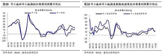 中小板凈利潤(rùn)同比增速較中報(bào)略回升。17Q3/17Q2/17Q1中小板歸屬母公司凈利潤(rùn)累計(jì)同比為23.3%/23.2%/26.7%,單季度同比為23.5%/20.8%/26.7%。剔除券商后,歸母凈利累計(jì)同比為24.5%/24.3%/27.1%,單季度同比為25.0%/22.4%/27.1%,中小板凈利同比增速較中報(bào)略有回升。進(jìn)一步看中小板指數(shù)的情況,歸母凈利潤(rùn)累計(jì)同比為17.5%/13.6%/19.2%,單季度同比為18.0%/9.3%/19.2%。剔除券商后,中小板指歸母累計(jì)凈利同比為19.7%/19.1%/24.5%,單季度同比為20.6%/15.2%/24.5%,增速也略有回升。17Q3/17Q2/17Q1中小板ROE(TTM)為9.6%/9.4%/8.9%,凈利率為7.8%/7.7%/7.2%,資產(chǎn)周轉(zhuǎn)率為0.52/0.51/0.12/次,資產(chǎn)負(fù)債率為57.3%/57.4%/56.9%。根據(jù)歷史上中小板三季報(bào)凈利潤(rùn)占全年比重均值和17年三季報(bào)業(yè)績(jī),我們推算全年中小板凈利同比增速為25.5%,ROE為9.7%。
