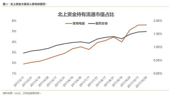 當(dāng)大部分國(guó)內(nèi)主流機(jī)構(gòu)的資金都在兌現(xiàn)白馬龍頭浮盈的時(shí)候,陸股通的數(shù)據(jù)顯示,北向資金大量購(gòu)買了家電、醫(yī)藥的股票,并且導(dǎo)致外資占這些行業(yè)流動(dòng)市值的比例快速提升。尤其是在國(guó)慶節(jié)之后的家電板塊,雖然國(guó)內(nèi)基金經(jīng)理存在很大的分歧,但在每天陸股通大量買入的情況下,家電成為領(lǐng)漲的板塊。白馬龍頭的話語權(quán)已經(jīng)在逐步轉(zhuǎn)移到外資手中。