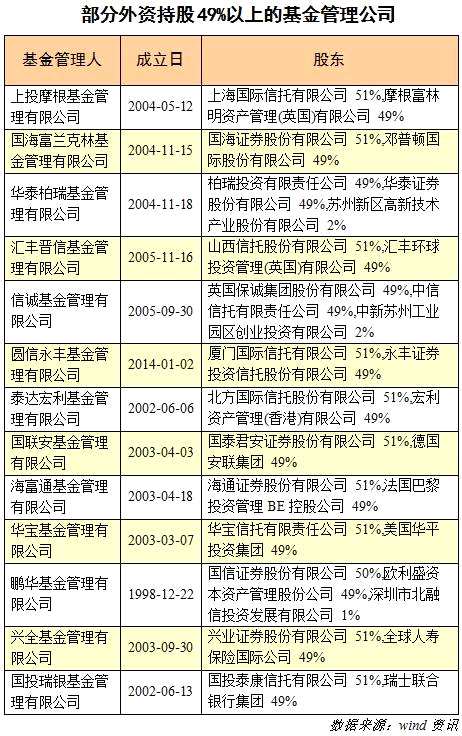 此外,不少基金公司早已引進(jìn)外資做大股東,且持股比例緊貼原有的49%上限。根據(jù)Wind數(shù)據(jù)統(tǒng)計(jì),目前境內(nèi)共有41家中外合資基金公司,不少外資持股比例達(dá)到了49%。
