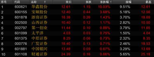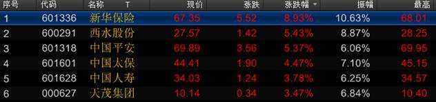 受此刺激,10日下午開盤后券商保險(xiǎn)板塊急速拉漲。券商股中,華鑫股份(600621) 瞬間漲停,寶碩股份(600155) 、浙商證券(601878)等均有不同程度拉升。而申萬保險(xiǎn)板塊更是全線拉升,其成分股新華保險(xiǎn)(601336) 、西水股份(600291)中國(guó)平安(601318) 、中國(guó)太保(601601)中國(guó)人壽(601628)天茂集團(tuán)(000627) 漲幅分別為8.93%、5.43%、5.37%、4.47%、3.78%和3.47%。