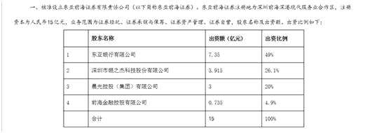 同樣在6月19日,證監(jiān)會(huì)核準(zhǔn)設(shè)立東亞前海證券,注冊(cè)資本15億元。其中,東亞銀行出資7.35億元,占比49%,而銀之杰(300085) 、晨光控股、前海金控出資比例分別為26.1%、20%、4.9%。