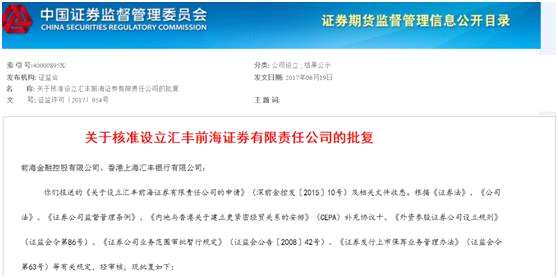 6月19日,證監(jiān)會(huì)核準(zhǔn)設(shè)立匯豐前海證券,匯豐銀行出資9.18億元,持股比例突破49%,達(dá)到了51%。而前海金融控股有限公司出資8.82億元,占比49%。