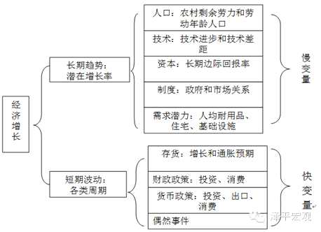 經(jīng)濟(jì)增長是由趨勢和波動組成的。長期趨勢是指潛在增長率,由人口、技術(shù)、資本、勞動、需求潛力等慢變量決定的。短期波動是指各類周期,由存貨、投資、財政貨幣政策、偶然事件等快變量決定。