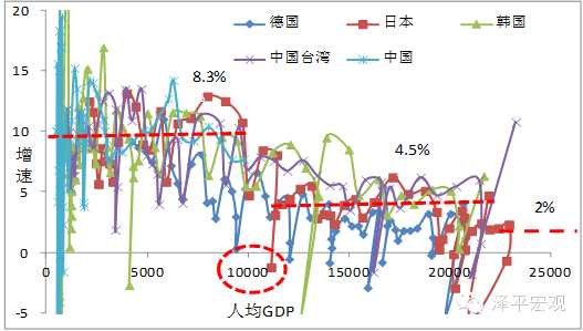 1960年以來,在全球101個追趕經(jīng)濟(jì)體中,只有13個國家和地區(qū)完成了追趕任務(wù),邁過高收入經(jīng)濟(jì)體門檻,成功概率僅為13%。在這13個成功實現(xiàn)增速換擋的經(jīng)濟(jì)體中有4個最優(yōu)秀的畢業(yè)生:德國、日本、中國臺灣和韓國,這四個優(yōu)秀畢業(yè)生大約在人均GDP11000國際元附近,經(jīng)濟(jì)增速平均從8.3%降到4.5%,降幅在50%左右。