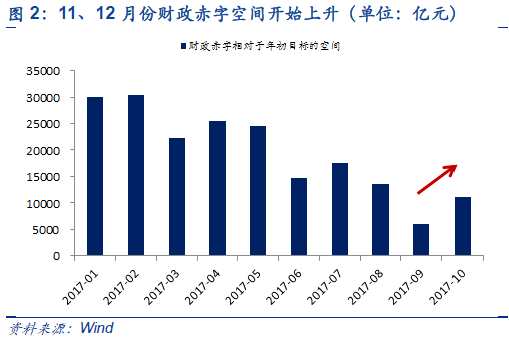 符合預(yù)期的是10月份的財(cái)政支出同比增速有所回落,我們的周報(bào)此前判斷過(guò),從財(cái)政收入比來(lái)看,財(cái)政支出力度下半年會(huì)逐漸放緩,從目前評(píng)估看,放緩程度依然溫和。不考慮調(diào)節(jié)基金,今年赤字目標(biāo)是2.38萬(wàn)億。按照過(guò)去幾個(gè)月財(cái)政狀況,9月份財(cái)政累計(jì)赤字1.77萬(wàn)億,相對(duì)于年初赤字目標(biāo),四季度財(cái)政空間約6千億。隨著10月份財(cái)政支出放緩,而財(cái)政收入增長(zhǎng)5.7%,10月份財(cái)政累計(jì)赤字1.26萬(wàn)億,11、12月份財(cái)政空間約1.12萬(wàn)億。