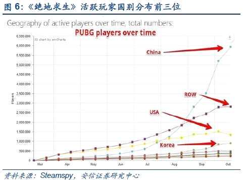 由韓國(guó)Bluehole(藍(lán)洞)公司開發(fā)的《絕地求生:大逃殺》自2017年3月23日發(fā)行以來(lái),銷量屢創(chuàng)新高,成為2017年最矚目的現(xiàn)象級(jí)游戲。新款FPS游戲“吃雞”以其逼真的模擬環(huán)境、殘酷的淘汰機(jī)制和強(qiáng)大的社交屬性迅速吸引了海量受眾,遠(yuǎn)超同類型的《CS:GO》與《守望先鋒》,據(jù)Steam Spy平臺(tái)統(tǒng)計(jì),截至10月底,《絕地求生:大逃殺》銷量累計(jì)突破2000萬(wàn)(10月29日到11月2日,僅五天內(nèi)就賣出200萬(wàn)份)。其累計(jì)用戶已達(dá)20,080,620人,而活躍玩家人數(shù)中,中國(guó)玩家?guī)缀跽紦?jù)“半壁江山”,超過(guò)600萬(wàn),遠(yuǎn)高于排第二位的美國(guó)和第三位的韓國(guó),并呈現(xiàn)高增長(zhǎng)趨勢(shì)。