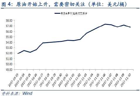我們傾向于判斷投資者的經(jīng)濟(jì)預(yù)期會(huì)逐漸穩(wěn)定,而此前領(lǐng)先大幅調(diào)整的周期股存在反彈機(jī)會(huì)。投資者需要密切注意的油價(jià)的上升。我們傾向于認(rèn)為沙特反腐是油價(jià)上漲的催化劑,但更重要的原因是全球經(jīng)濟(jì)進(jìn)一步復(fù)蘇的預(yù)期。當(dāng)“大宗之王”持續(xù)走強(qiáng),那么周期品的配置價(jià)值將進(jìn)一步上升。當(dāng)然這可能意味未來(lái)PPI環(huán)比強(qiáng)于市場(chǎng)預(yù)期,甚至預(yù)示著明年CPI的壓力,但對(duì)于當(dāng)前A股,CPI作為核心變量為時(shí)尚早。