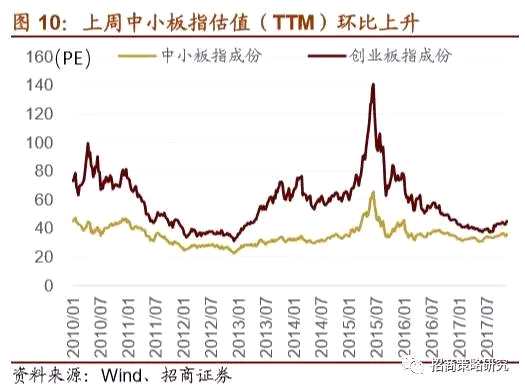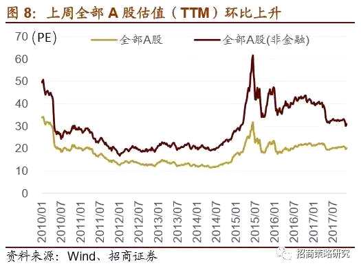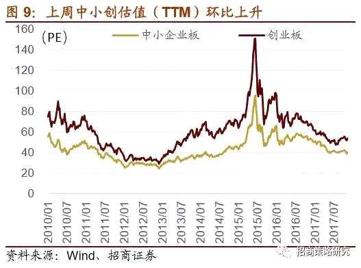 估值方面,上周全部A股估值(TTM)環(huán)比上升,從19.76上升至20.21,剔除金融后全部A股估值從30.13上升至30.99,中小板估值從38.92上升至40.16,創(chuàng)業(yè)板估值從51.84上升至53.67。滬深300與中證500成分股整體估值上升。
