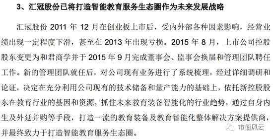 大意是,我們和君商學(xué)進(jìn)來(lái)以后,會(huì)好好鼓搗上市公司的業(yè)務(wù),琢磨著將匯冠股份“打造智能教育服務(wù)生態(tài)圈”。