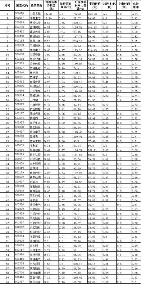 在“高送轉(zhuǎn)”布局中,具有真正稀缺性的次新股也有一定價(jià)值,上述私募人士表示,次新股留存收益較多、凈資產(chǎn)較高、股本相對較少,有能力也意愿進(jìn)行“高送轉(zhuǎn)”。此次推出10轉(zhuǎn)10派5的凱普生物,2017年4月12日才登陸創(chuàng)業(yè)板,公司每股公積金高達(dá)5.8元,流通盤2200萬股,高送轉(zhuǎn)方案推出前流通市值僅10億元,正是此類“高送轉(zhuǎn)”次新股的典型。