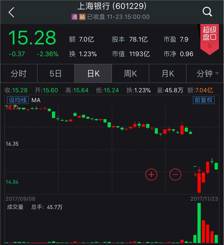 11月11日,上海銀行公告,上市流通的限售股為公司首次公開(kāi)發(fā)行限售股,共計(jì)29.26億股,涉及34649名股東,鎖定期為自公司股票上市之日起12個(gè)月,該部分限售股將于2017年11月16日鎖定期屆滿并上市流通。據(jù)11月15日股價(jià)計(jì)算,11月16日上海銀行解禁股市值高達(dá)500億元,在巨量解禁股資金的圍堵下,上海銀行一字跌停,次日再度下跌2.14%。