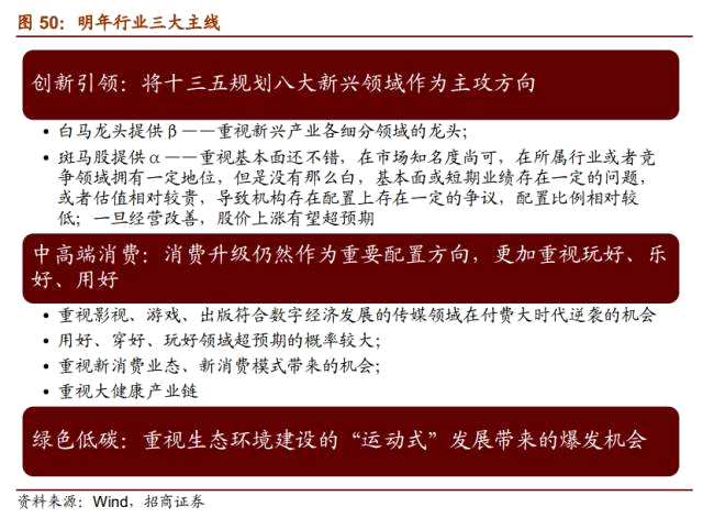 總體上而言,明年的配置思路就是——金融打底倉,行業(yè)三主線(創(chuàng)新引領(lǐng)(八大細(xì)分領(lǐng)域)、中高端消費(fèi)、綠色低碳)。