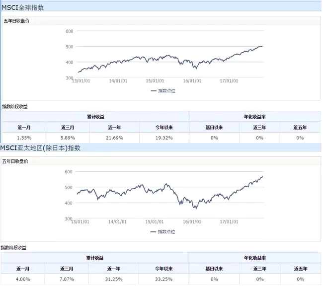 2017年初至今,亞洲股市已經(jīng)跑贏了其他市場。受美股新高影響,本月22日MSCI亞太指數(shù)更是在盤中突破10年高位。香港恒生指數(shù)、日韓股市集體上漲。WIND數(shù)據(jù)顯示,年初至今MSCI全球市場指數(shù)上漲19.32%,MSCI除日本亞太地區(qū)指數(shù)同期則上漲了33.25%。
