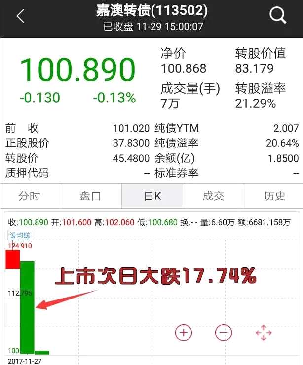 嘉澳轉(zhuǎn)債上市第二日大跌17.74%,今日再度下跌0.13%,報(bào)收100.89元;