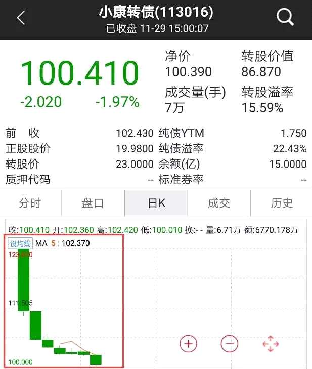小康轉(zhuǎn)債今日?qǐng)?bào)收100.41元,上市7日未見一根陽線,連收7根陰線。