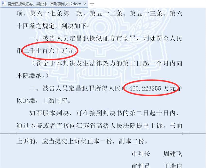 根據近期上傳到中國裁判文書網的《江蘇省南京市中級人民法院刑事判決書(2017)蘇01刑初31號》顯示,曾經的“股市黑嘴”吳定昌在2009年因推薦股票獲取非法利益,也就是“搶帽子”交易,最終被罰沒3200萬元。