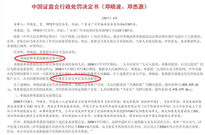 在2011年,證監(jiān)會對以同樣手法謀利的鄧曉波和鄧悉源作出處罰。同樣模式的“先買入股票,再推薦股票,后賣出股票”的行為構成操縱證券市場罪。不過,同樣的操作方式,這兩人竟然還虧了247.83萬元。你看,“股神”也都用上操縱市場的手法了,也沒賺到錢。最終,兩人分別被罰了33萬元、43萬元。
