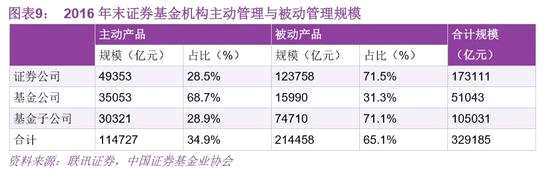 在短短四年里(2012-2016),證券基金機(jī)構(gòu)的資管總規(guī)模從不足10萬億飆升至32.92萬億,其中證券公司17.31萬億,基金公司與基金子公司分別為5.1萬億與10.50萬億。在如此大規(guī)模的資管規(guī)模中,有將近21.45萬億是屬于被動(dòng)管理的通道類資管,其中被譽(yù)為“通道之王”的基金子公司的通道規(guī)模比例達(dá)到71.1%,券商資管為71.5%;而具有主動(dòng)管理傳統(tǒng)的公募基金的比例僅為31.3%。