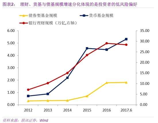 3、打破后怎么辦?在過去幾年時(shí)間里,各類資管產(chǎn)品都經(jīng)歷了蓬勃的發(fā)展,規(guī)模節(jié)節(jié)攀升,但不斷攀升的規(guī)模背后,我們看到的是居民的低風(fēng)險(xiǎn)偏好。被視為剛兌的貨幣基金和銀行理財(cái)在在2012-2016年間分別增長了3.8萬億與22萬億,而同樣是投資于固定收益市場的債券型基金,規(guī)模僅增長了1.4萬億,權(quán)益類型的股票型基金僅增長2千億左右。