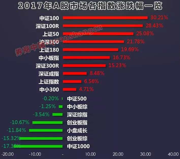 有網(wǎng)友調(diào)侃:如果你沒在中證100里挑股票,這一年你基本上就是負(fù)收益了。這不是玩笑,今年的A股市場是投資風(fēng)格變化最大的一年。從全年表現(xiàn)來看,滬指全年漲幅為6.56%,創(chuàng)業(yè)板指卻下跌10.67%。有業(yè)績支撐的白馬股大漲,但是估值虛高、業(yè)績表現(xiàn)不佳的中小市值股正被市場拋棄??傮w來看,2017年A股呈現(xiàn)出以下六大特征: