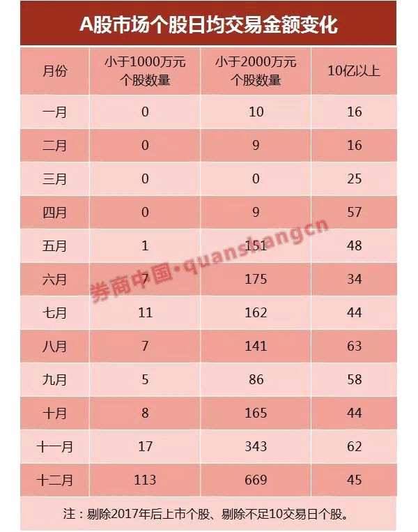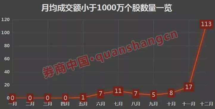 據(jù)券商中國記者統(tǒng)計(jì),日均成交額低于1000萬的個(gè)股,在今年前4個(gè)月從未出現(xiàn)過,5月份僅1只股票日均成交額低于1000萬。進(jìn)入11月份,日均成交額低于1000萬的個(gè)股開始增多,11月份多達(dá)17只。12月份這一數(shù)據(jù)更為驚人,多達(dá)113只個(gè)股日均成交額低于1000萬。