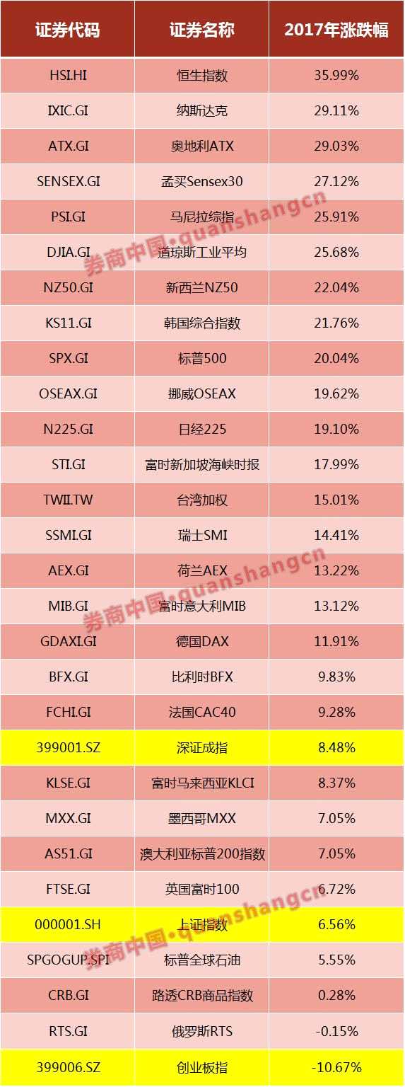全球市場來看,今年表現(xiàn)最好的是恒生指數(shù),今年大漲35.99%,創(chuàng)業(yè)板指跌幅10.67%,排名最后。