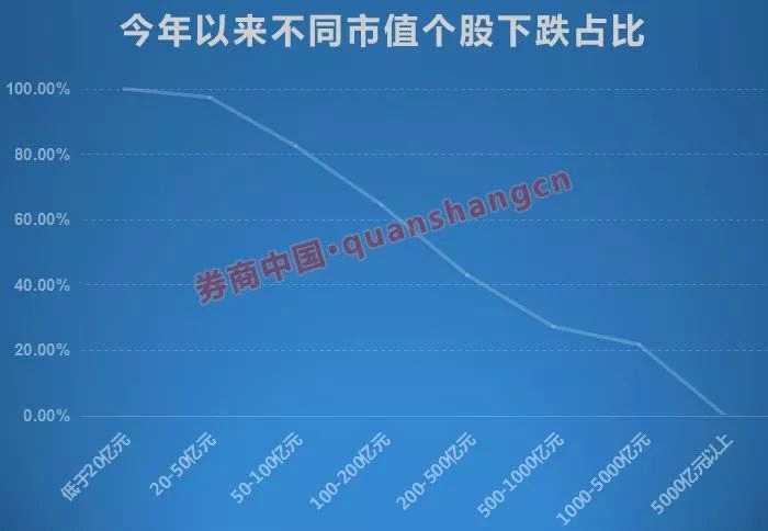 市值低于50億元的個(gè)股,下跌占比高達(dá)97.43%,市值超過500億元,下跌個(gè)股占比僅23.33%。