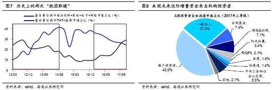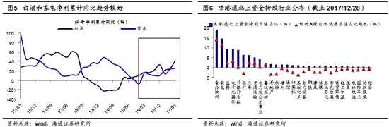 三是邊際增量資金仍是外資和保險,他們配置上偏好消費(fèi)白馬。2013年投資電子和傳媒為代表的成長白馬股的主力是公募,其投資策略靈活多變,而2017年投資家電和白酒的主力軍是外資和保險,他們天生偏好消費(fèi)股。以外資為例,截止2017/12/28,陸港通北上資金持股中食品和家電行業(yè)市值占比為33.7%,而A股自由流通市值占比為8.4%?!缎聲r代,新牛市——2018年A股投資策略-20171209》中我們分析過,A股將從2017年的存量市步入2018年的溫和增量市,其中預(yù)計2017/2018年外資流入2277/3000億元,保險資金流入1700/2900億元(扣除港股投資)。而公募基金的配置也沒有13年那么極致,根據(jù)基金季報重倉股統(tǒng)計,13年公募持有的TMT+醫(yī)藥目前總市值11.46萬億,17年公募持有的食品飲料+家電+電子+保險,目前總市值9.80萬億,兩類白馬市值差異不大,13年底14年初成長白馬占比高點46%,17Q3消費(fèi)白馬占比34%。