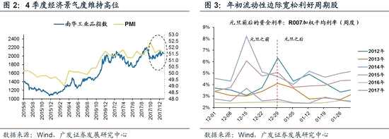 4、一元復始。周期股“躁動”展開:市場對于2018年需求放緩有所擔憂,我們對全年經濟增長韌勁不悲觀,而年初需求不可證偽,供給看得清楚,是個好的交易性機會時點。4季度經濟數(shù)據(jù)環(huán)比不差,將帶來周期股的年報行情——10月以來,PMI維持在51以上,4季度的宏觀經濟整體不差。同時,南華工業(yè)品指數(shù)環(huán)比持續(xù)抬升,周期品價格維持高位。周期板塊景氣持續(xù)改善將帶來年報超預期,增加周期股的短期配置價值;年初需求無法證偽,周期股存在交易性機會——市場對2018年需求放緩有所擔憂,但我們對全年經濟增長的韌性并不悲觀(地產投資韌性+制造業(yè)中周期修復)。在年初宏觀數(shù)據(jù)的“真空期”,供給收縮能看得清(基本不會大幅放寬),而需求無法證偽,周期股將迎來較好的交易性機會;同時,年末資金緊張階段過去后,年初短端利率有望緩和,周期品對流動性較為敏感,配置價值凸顯。