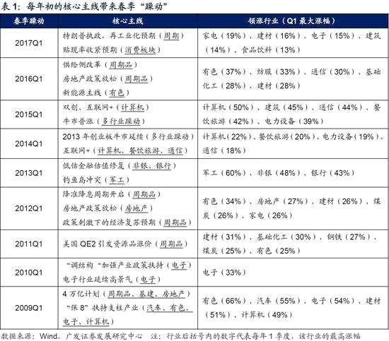 2、“春季躁動”幾乎每年都有,“躁動”行業(yè)也存在一定的線索,年初的核心主線會引領相關行業(yè)的“躁動”。據(jù)統(tǒng)計,歷史上幾乎年年都存在“春季躁動”——我們統(tǒng)計09年以來,每年1季度各行業(yè)的最高漲幅(1季度最高點/最低點),幾乎都有部分行業(yè)“躁動”;“春季躁動”的行業(yè)大多有跡可循,當年年初的核心主線通常會帶動相關行業(yè)在1季度獲得較大漲幅——舉例來看:17年初特朗普上臺后美國再工業(yè)化預期帶來周期行業(yè)的“躁動”;16年供給側改革和地產政策放松造就的也是周期行業(yè)的“躁動”;15年的雙創(chuàng)和互聯(lián)網(wǎng)主線帶來的是計算機行業(yè)的大幅上漲;14年初的“互聯(lián)網(wǎng)+”主線引領計算機、通信等行業(yè)的大漲……周期股經歷了12月的調整之后,疊加年初環(huán)保稅的影響,我們建議把握“一元復始、周期躁動”的核心主線,重點關注基礎化工、建材、有色、鋼鐵、機械等周期行業(yè)的交易機會。