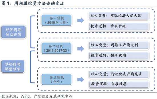 3、宏觀經濟框架和政策監(jiān)管方向的調整,帶來周期股投資策略的嬗變,我們應當從供需穩(wěn)態(tài)的視角重新審視周期股投資的方法論。我們認為,周期股投資方法論正進入第三階段——(1)第一階段:宏觀經濟大幅波動(2000年-2010年),周期股投資主要看“量價”邏輯,宏觀需求一旦起來就能買周期股;(2)第二階段:周期品產能過剩(2011年-2017Q3),周期股投資主要看供給收縮的程度,需求不差、供給收縮兼?zhèn)洳拍苜I周期股;(3)第三階段:當前,在供給收縮常態(tài)化下,周期品從價格波動(大起大落)轉向價格穩(wěn)態(tài)(高位震蕩),看到需求端修復(預期)買周期股。中國經濟已經由“增量經濟”下的需求管理轉向“存量經濟”下供給體系質量提升,相應的,周期股投資方法論,也正發(fā)生轉變:周期股投資看宏觀需求→周期股投資看供給收縮(需求不差)→周期股投資看供給收縮常態(tài)化下的需求修復(或曰:供需穩(wěn)態(tài))。