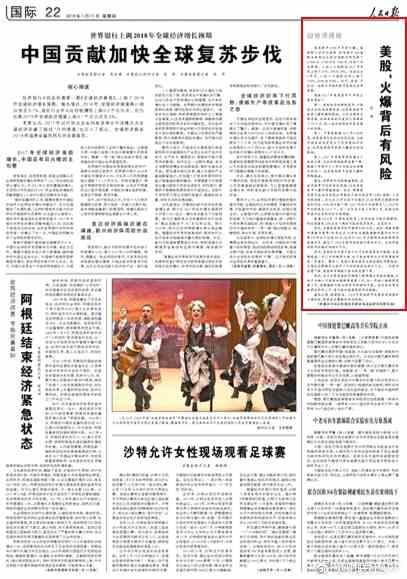 摘要:人民日報刊登社科院研究員文章稱,今年盡管美股上升動能可能仍將持續(xù),但出現(xiàn)整體20%左右下調(diào)的可能性是存在的。盛極必衰,規(guī)律使然。今年美股走勢具有很強(qiáng)的不確定性,投資者應(yīng)警惕和防范風(fēng)險?!?/p>