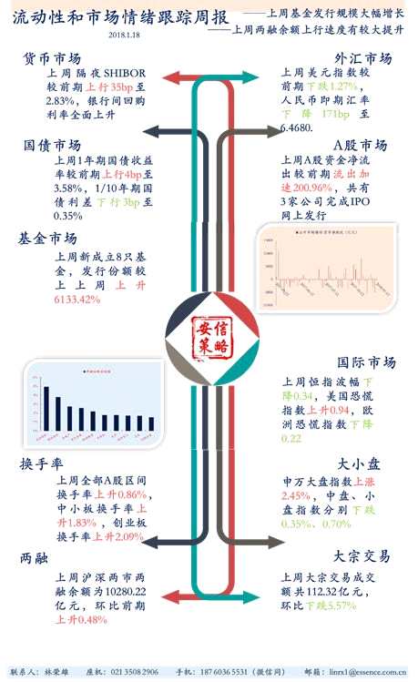 摘要: 重視年初基金發(fā)行規(guī)模大幅增長流動(dòng)性和市場(chǎng)情緒跟蹤周報(bào)安信策略來自微信公眾號(hào):陳果A股策略2018.1.18■風(fēng)險(xiǎn)提示:經(jīng)濟(jì)不達(dá)預(yù)期;地緣政治風(fēng)險(xiǎn);通脹超預(yù)期1流動(dòng)性:上周基金發(fā)行規(guī)模大幅增長解讀:上周