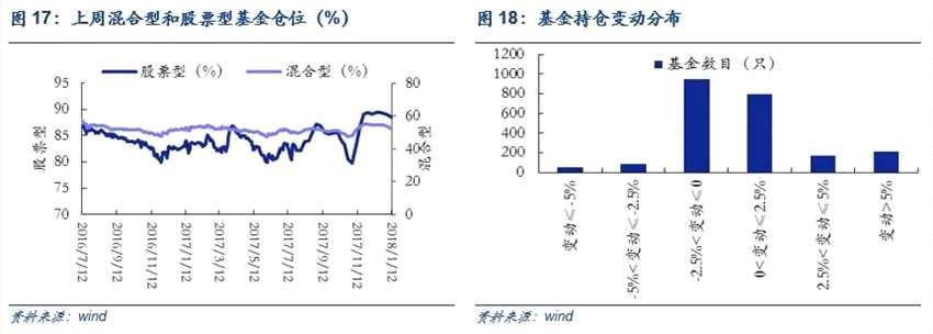 上周股票型基金倉位由88.9%降至88.38%,混合型基金倉位由53.36%降至51.83%。所有基金當(dāng)中,減倉基金占51.14%,約49.28%的基金減倉幅度小于45.41%。