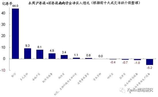 個(gè)股層面,根據(jù)十大成交活躍個(gè)股的資金流向情況統(tǒng)計(jì)來看,本周南下資金繼續(xù)大幅流入銀行板塊(工商銀行(601398) ,19.4億港幣;農(nóng)業(yè)銀行(601288) ,13.3億港幣;建設(shè)銀行(601939) ,11億港幣),同時(shí)也流入港交所(9.3億港幣)、騰訊控股(4.9億港幣)、新城發(fā)展控股(4.6億港幣)等;但流出中芯國際(5.2億港幣)、瑞聲科技(1.9億港幣)和民生銀行(600016) (1.6億港幣)等。