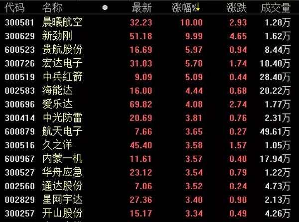 軍工板塊集體走強(qiáng),成為除了金融股之外的最大亮點(diǎn)。安達(dá)維爾(300719)、晨曦航空(300581)、新勁剛(300629)漲停,宏達(dá)電子(300726)、貴航股份(600523) 等漲逾5%。