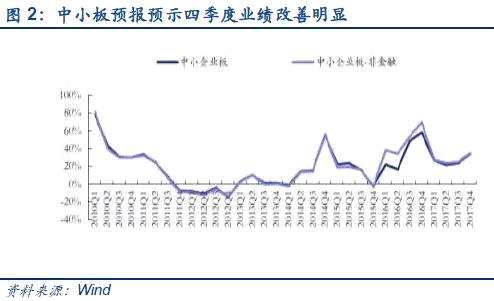 最后,從年報(bào)的預(yù)披露情況來(lái)看,雖然有一些公司出現(xiàn)了業(yè)績(jī)大幅低預(yù)期,但中小板板塊整體仍維持了高增長(zhǎng)。截至1月6日,中小板業(yè)績(jī)預(yù)報(bào)披露率達(dá)99.9%。根據(jù)已披露的2017年年報(bào)業(yè)績(jī)預(yù)告,按照可比口徑計(jì)算得出中小板Q4單季預(yù)告凈利潤(rùn)同比增速預(yù)計(jì)為34.08%,較Q3的同比增速23.59%明顯提升,預(yù)計(jì)增速也將強(qiáng)于主板,目前創(chuàng)業(yè)板披露率過(guò)低,但我們認(rèn)為中小板靚麗的年報(bào)預(yù)告也有助于使得投資者相信隨著中國(guó)經(jīng)濟(jì)增速回穩(wěn),盈利趨勢(shì)好的不僅僅局限于少數(shù)龍頭公司,投資者對(duì)于成長(zhǎng)股基本面的信心將逐漸恢復(fù)。