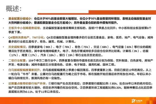 Q4增持消費地產,TMT分化:Q4主動偏股型基金增持最多的行業(yè)前五是食品、家電、醫(yī)藥、地產、電氣設備;減持最多的行業(yè)前五是電子、有色、建筑、機械、計算機。