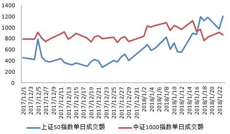 統(tǒng)計顯示,上證50指數(shù)的日成交額自去年12月以來探底回升,今年1月17日單日成交額順利突破1000億元大關(guān)。