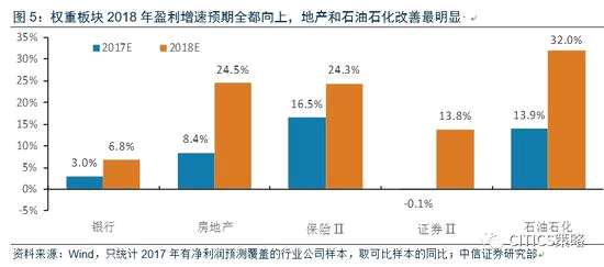 從大板塊持倉的內(nèi)部結(jié)構(gòu)來看,我們本期調(diào)倉保持了大金融板塊(銀行、房地產(chǎn)和券商)的比重,核心邏輯仍舊在于純粹從估值切換和盈利預(yù)測來看行業(yè)的話,主要的機(jī)會(huì)依舊是權(quán)重類的大行業(yè)。從下圖中可以看到,市場一致預(yù)期顯示銀行、保險(xiǎn)、券商、房地產(chǎn)、石油石化行業(yè)的2018年盈利增速普遍高于2017年。只要短期行業(yè)景氣數(shù)據(jù)配合,即使是權(quán)重板塊,市場并不吝嗇于給估值。