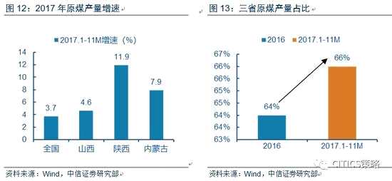 ii)煤炭先進(jìn)產(chǎn)能替代邏輯下,運(yùn)量支撐增強(qiáng)。供給側(cè)改革背景下,鼓勵(lì)煤炭優(yōu)質(zhì)產(chǎn)能,大秦線腹地山西、陜西和內(nèi)蒙古是我國優(yōu)質(zhì)煤主產(chǎn)區(qū),2017年1-11月,全國原煤產(chǎn)量同比增速3.7%,而陜西、山西和內(nèi)蒙古原煤產(chǎn)量分別同比增長11.9%、4.6%和7.9%,均明顯高于全國平均增速。假設(shè)這三個(gè)省份2018年煤炭產(chǎn)量增長5-10%,則總增量有望達(dá)到1億-2億噸,對大秦線的運(yùn)量形成穩(wěn)定支撐。