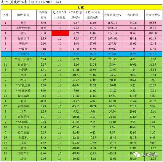 ?、傩袠I(yè):2017.5.12-2018.1.26 行情修復(fù)強(qiáng)于上證綜指行業(yè)板塊有家電、非銀金融、銀行、食品飲料、房地產(chǎn)、煤炭。其中,近兩周均強(qiáng)于上證綜指板塊有銀行。