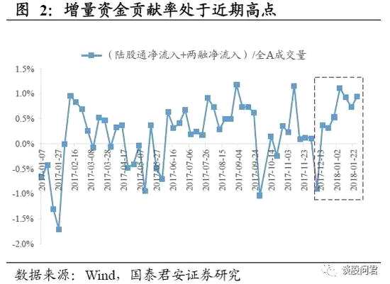 2018 年以來的變與不變,“虹吸效應(yīng)”下春季行情還未結(jié)束。相比于2017年,2018 年以來的行情演繹變化有三,不變有三。變化在于:1)海外經(jīng)濟(jì)再確認(rèn)使得市場(chǎng)預(yù)期由2017 年的海外復(fù)蘇分歧走向2018 年的中國受益分歧;2)供給側(cè)改革的階段性成效使得去杠桿核心矛盾由2017 年的實(shí)體壓力變?yōu)?018 年的金融壓力;3)數(shù)據(jù)真空期對(duì)應(yīng)預(yù)期活躍期,有限增量資金入場(chǎng)使得博弈環(huán)境由2017 年的存量共識(shí)轉(zhuǎn)變?yōu)?018 年年初的增量分歧。不變?cè)谟冢河芰π迯?fù)仍是核心邏輯、風(fēng)險(xiǎn)偏好仍未明顯提升、大小分化仍將持續(xù)。變化之三和不變之三共同強(qiáng)化了春季以來的市場(chǎng)風(fēng)格,“虹吸效應(yīng)”之下的春季行情還未結(jié)束。就市場(chǎng)非常關(guān)心的資金層面來看,存量市場(chǎng)整體轉(zhuǎn)向增量市場(chǎng)仍需要時(shí)間,但市場(chǎng)流動(dòng)性已有有限修復(fù)跡象,表現(xiàn)為部分增量資金入場(chǎng)。從北上資金來看,1 月以來每周平均凈流入89 億元;從兩融數(shù)據(jù)來看,1 月以來每周平均凈流入139 億元。因此,綜合海內(nèi)外資金情況,每周凈流入228 億元,對(duì)周度Wind 全A 成交量的貢獻(xiàn)率達(dá)到近期高點(diǎn)(1%附近)。一季度處于政策、經(jīng)濟(jì)數(shù)據(jù)空窗期和預(yù)期活躍期,春季開工旺季使得經(jīng)濟(jì)動(dòng)能樂觀預(yù)期無法證偽、一季度放貸積極使得春節(jié)前后流動(dòng)性無憂,“虹吸效應(yīng)”下的春季躁動(dòng)行情仍將繼續(xù)延續(xù)。